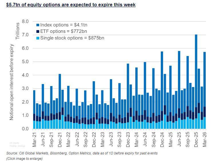 Meanwhile, traders braced for a historic amount of March options expiry. Roughly $5.7 trillion in notional options tied to individual US stocks, indexes and exchange-traded funds are set to expire on Friday in the quarterly event that traders have dubbed the “triple-witching”, the largest March expiry in 30 years and one the 4th largest ever. That includes $4.1 trillion in index contracts, $772 billion in exchange-traded funds and $875 billion in single-stock options. The event has a reputation for triggering abrupt price swings as large pools of derivatives exposure suddenly vanish. It also tends to reset dealer gamma sharply lower, unleashing an "unclenching" that lead to higher volatility in subsequent days. The scale of this week’s expiration is also notable relative to the broader market. At 8.4% of Russell 3000 Index market capitalization, it’s well above historical norms, amplifying the potential for positioning-driven flows.