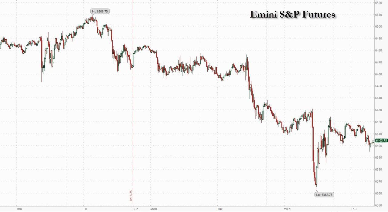 US equity futures dropped, extending the recent selloff into its fifth day, as traders stayed guarded ahead of the Federal Reserve’s gathering at Jackson Hole. As of 8:00am, S&P 500 futures fell 0.2%, while Nasdaq 100 futures were flat after a two-day selloff that erased 2% off the index. In premarket trading, Nvidia rose 0.8% while most Magnificent Seven peers posted losses. Retail giant Walmart brought Q2 earnings season to an unofficial close after reporting an EPS miss (68c vs exp. 74c) and even though it lifted guidance (now expects net sales to rise 3.75% to 4.75% this year, versus previous forecast of a 3% to 4%) that wasn't enough for the market, however, and the stock dropped in premarket trading. European stocks dropped 0.3%, erasing an earlier gain, and snapping a three-day winning streak. US treasuries fell, pushing the yield on the 10-year higher to 4.31%. The dollar strengthened and reversed all of yesterday's losses while Brent crude rose to the highest in two weeks even as the rest of the commodity complex was mixed. It's a busy economic calendar: we get weekly jobless claims and August Philadelphia Fed business outlook (8:30am), S&P Global US PMIs (9:45am) and July leading index and existing home sales (10am). The Fed speaker slate includes Atlanta Fed President Bostic at 7:30am, the last central bank official slated to speak before Chair Powell’s discourse at Jackson Hole Friday