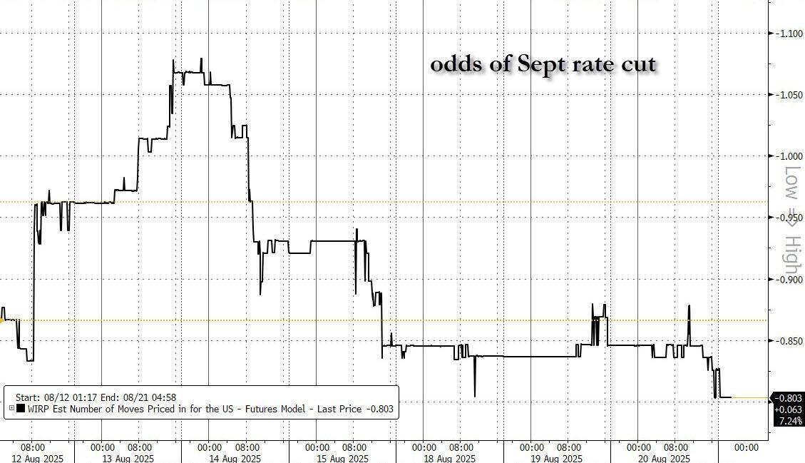 Looking at today's calendar, US economic data calendar includes weekly jobless claims and August Philadelphia Fed business outlook (8:30am), August preliminary S&P Global US PMIs (9:45am) and July leading index and existing home sales (10am). Fed speaker slate includes Atlanta Fed President Bostic at 7:30am, the last central bank official slated to speak before Chair Powell’s discourse at Jackson Hole Friday