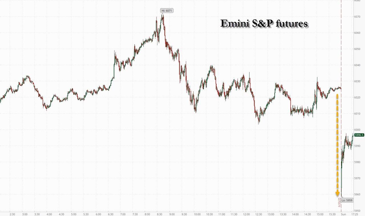 While emini S&P futures opened about 60 points, or 1% lower, at 6pm ET, they have since trimmed the loss in half, and at last check were back to just shy of 6,000, and about 2% below all time highs.