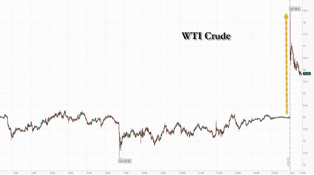 A similar kneejerk reaction was observed in oil which surged in early Monday trading, with some trading models indicated WTI contracts would open around $79/bbl - which it did - but then quickly retraced gains by half, rising $3 to $76...