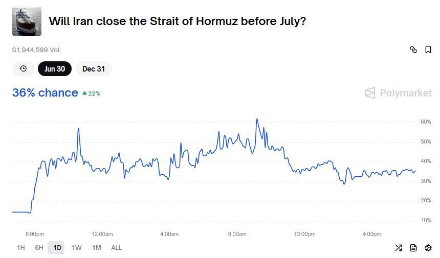 ... which is also well below the implied price assuming the Polymarket odds of a straits of Hormuz closure are accurate at 35% (assuming a fair value for oil of $60, and a worst case scenario of $120 at full closure), oil should be trading around $80.