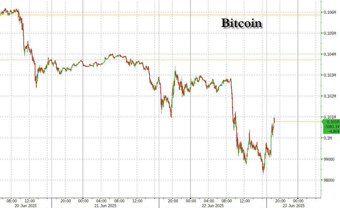 ... while the high beta "digital gold" - which as always was the only asset class open during the weekend's peak stress moments when panicans dumped it in droves as they always do - slumped as it always does when there is geopolitical turmoil, confirming yet again that bitcoin and the crypto space in general has a long way to go before it becomes a true safe asset.