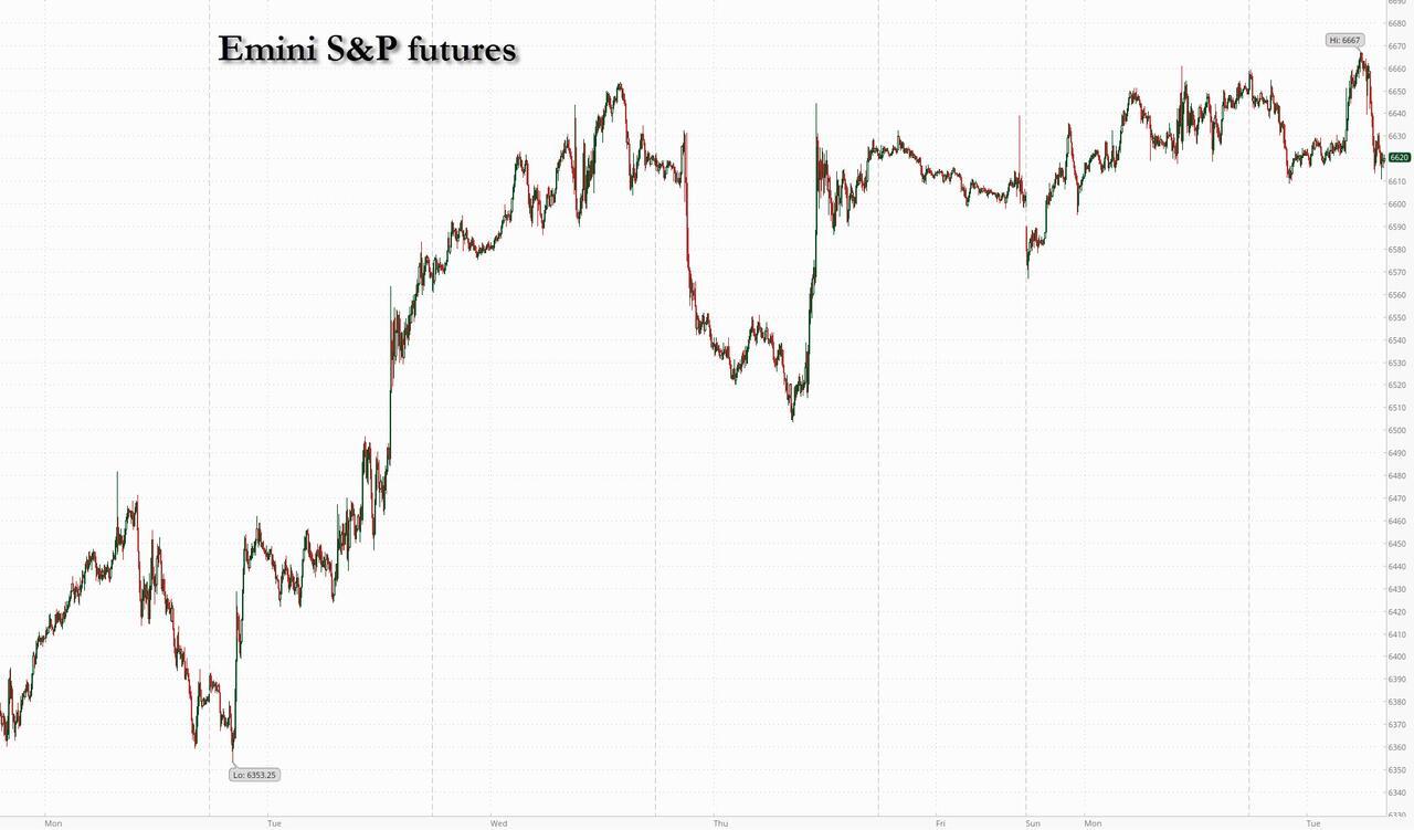 US futures reversed earlier gains and oil advanced following reports that Iran's Kharg island was targeted earlier on Tuesday, while the market was largely paralyzed ahead of Trump’s 8pm ET deadline for Iran to agree to a ceasefire or face escalation. As of 8:00am ET, S&P futures are down 0.4%, and Nasdaq futures slide 0.6%. In premarket trading, all Mag7 names are lower even as AVGO (+3% pre-mkt) is bid after a TPU supply pact with GOOGL (+55bps) while ASML (-80bps) is weaker following a proposed US law that would further curb semiconductor exports to China (targeting ASML’s deep ultraviolet lithography machine ). Managed care is well bid after the final Medicare Advantage rate of +2.48% (vs ~1% bogey) was released last night (HUM +9%, CVS +7%, UNH +6%, ALHC +11%). Bond yields rise 1bp, 10Y TSY yield at 4.34%, the USD is also higher while commodities are mixed with oil reversing earlier losses and rising over 2%. Today’s macro data focus is weekly ADP, Durable / Cap Goods, and NY Fed 1-year Inflation Expectations. Ultimately, expect weaker volumes today with some market swings on unconfirmed ceasefire / deal chatter.