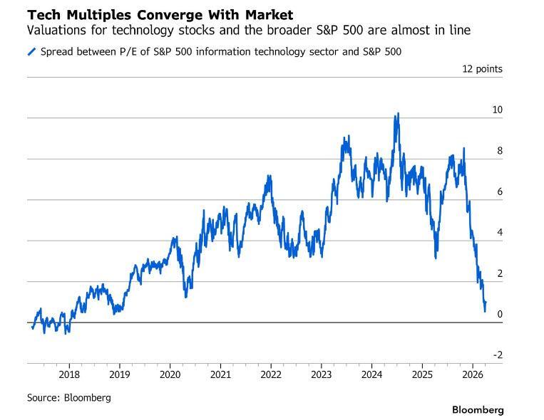 Meanwhile, the technology sector is looking increasingly attractive for investors as valuations fall below those of the wider stock market, according to Goldman strategists. Any lasting shock to the global economy from the war in Iran is also likely to benefit the sector as tech cash flows are less sensitive to economic growth, the strategists said.