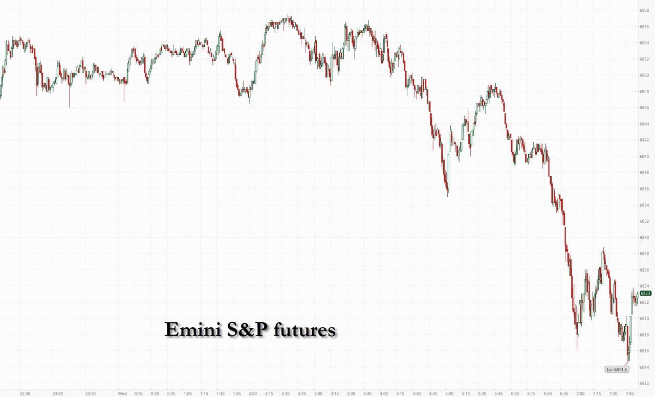 Futures have reversed modest overnight gains and are trading near session lows while small caps continue to outperform (for a record 12th day in a row) even as Japanese and global bond yields stabilize and the market awaits today's major catalysts including Trump's speech in Davos due within the hour after flight had to be changed due to mechanical issues, while the Supreme Court will consider whether Trump can fire the Fed’s Cook.Selling pressure initially eased after Trump struck a more conciliatory tone ahead of his departure for the World Economic Forum, even as he continued to insist the US should take control of the Danish territory. As of 8:00am, S&P futures are down 0.1%, while Nasdaq futures drop 0.3% with Mag7 names mixed in premarket trading, semis are bid; discretionary leading Staples; energy / mats seeing significant outperformance. Bond yields are 1-2bp lower and USD is once again lower on the day. Commodities are seeing strength in ags, natgas and precious, with gold approaching a record high at 4,900 The macro focus today is Davos and housing related data.