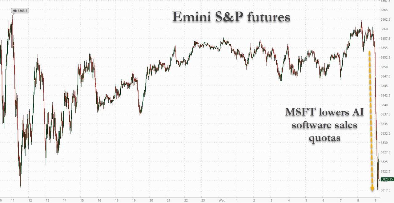 Futures suddenly tumbled just after 9am ET, when Bloomberg blasted a report from the Information, which cites two salespeople in Microsoft’s Azure cloud unit, and who claim that Microsoft has lowered expectations for how quickly it can get customers to spend money on newer AI products, known as agents, after many salespeople missed sales-growth goals.