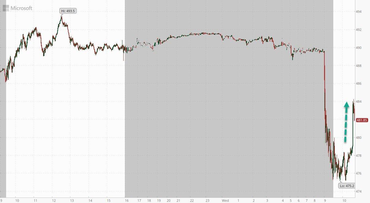 In kneejerk reaction, MSFT stock rebounds from session lows, and the drop is now less than 1% from the pre-report highs.