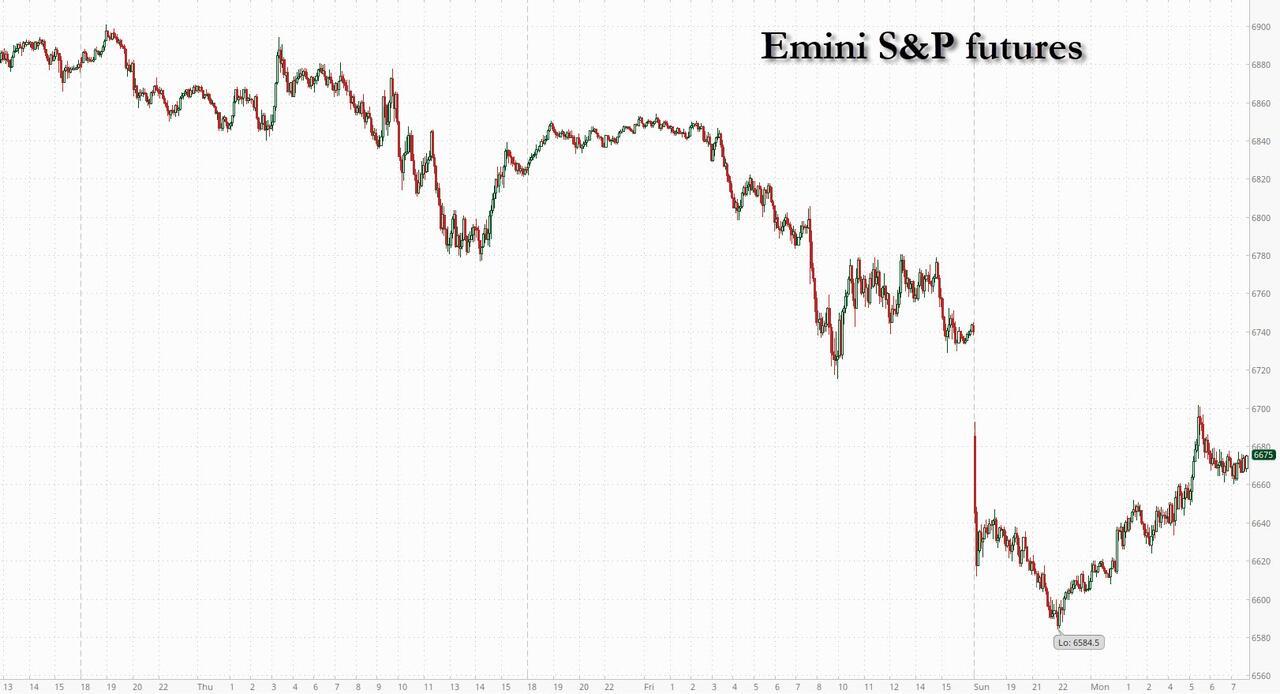 US futures tumbled and oil surged as the war in Iran showed little sign of deescalating over the weekend and led to more major Middle East producers curbing output. Still, futures retraced more than 50% off the overnight lows as WTI nearly touched $120 overnight, the highest since 2022, before dropping back to around $100 after a report G7 countries may release 300 million to 400 million barrels, or around 25% to 30% of the 1.2 billion barrels in strategic reserve. As of 8:00am ET, S&P futures are down 1%, although well off session lows, having tumbled as much as 2% earlier before the SPR news hit; in pre-market trading, Mag7 names are weaker, but certain AI plays are positive pre-mkt with Energy the standout sector and Defense bid higher, too. Generally, Defensives over Cyclicals. Bonds deepened losses while the dollar hit its highest level since January. Bond yields are higher, bear flattening, but Treasuries are outperforming global peers with European bonds in freefall due to fears of a spike in inflation driven by higher gas prices; Commodities are stronger led by Energy with all segments / sub-segments higher ex-precious metals which are being sold to fund margin calls in oil. WTI Crude futures have pared an increase of as much as 31% to about 13% but remain highest since 2022 as the war in the Middle East restricts supply via the Strait of Hormuz. Today's US economic data slate includes February New York Fed 1-year inflation expectations at 11am. Reports ahead this week include CPI, personal income and spending (includes PCE price indexes), 4Q GDP revision, JOLTS job openings and industrial production