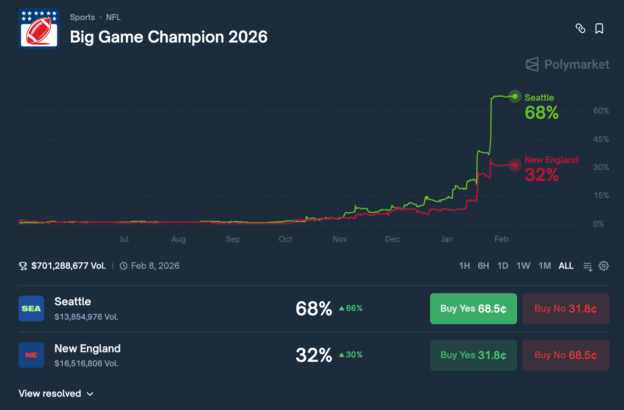 Today's matchup between Seattle and New England at Levi's Stadium in Santa Clara is expected to drive record trading volumes on prediction markets, according to Jordan Bender, a senior equity analyst at Citizens.