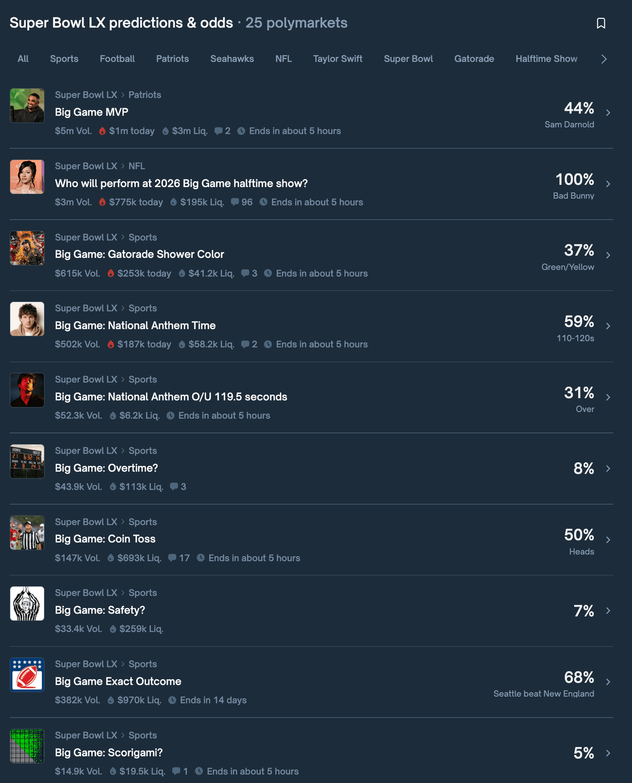 Polymarket's latest Super Bowl bets: