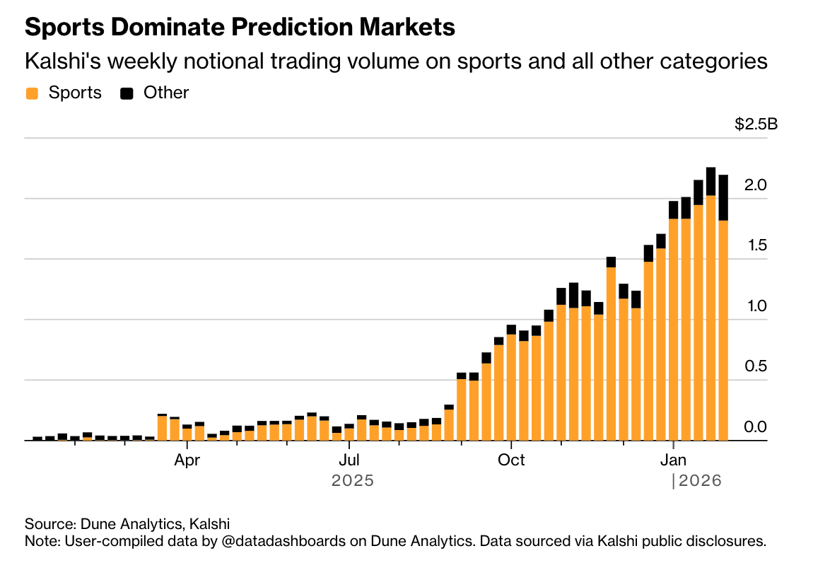 According to the Dune data dashboard, Kalshi saw nearly $10 billion in contracts traded in January, with the vast majority tied to sports betting (about $8.5 billion).