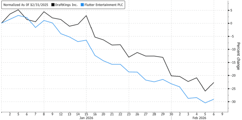 The rise of prediction markets ahead of Super Bowl weekend has become a major overhang for legacy sportsbooks, prompting investors to de-risk their equity positions and sending shares of Flutter Entertainment (owner of FanDuel) and rival DraftKings sharply lower year to date.