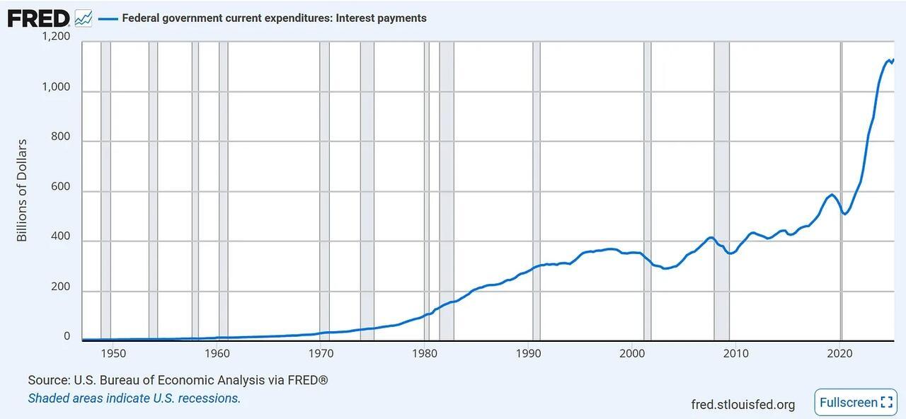 Federal government current expenditures: Interest payments in billions of U.S. dollars. Source: St. Louis Fed, U.S. Bureau of Economic Analysis.