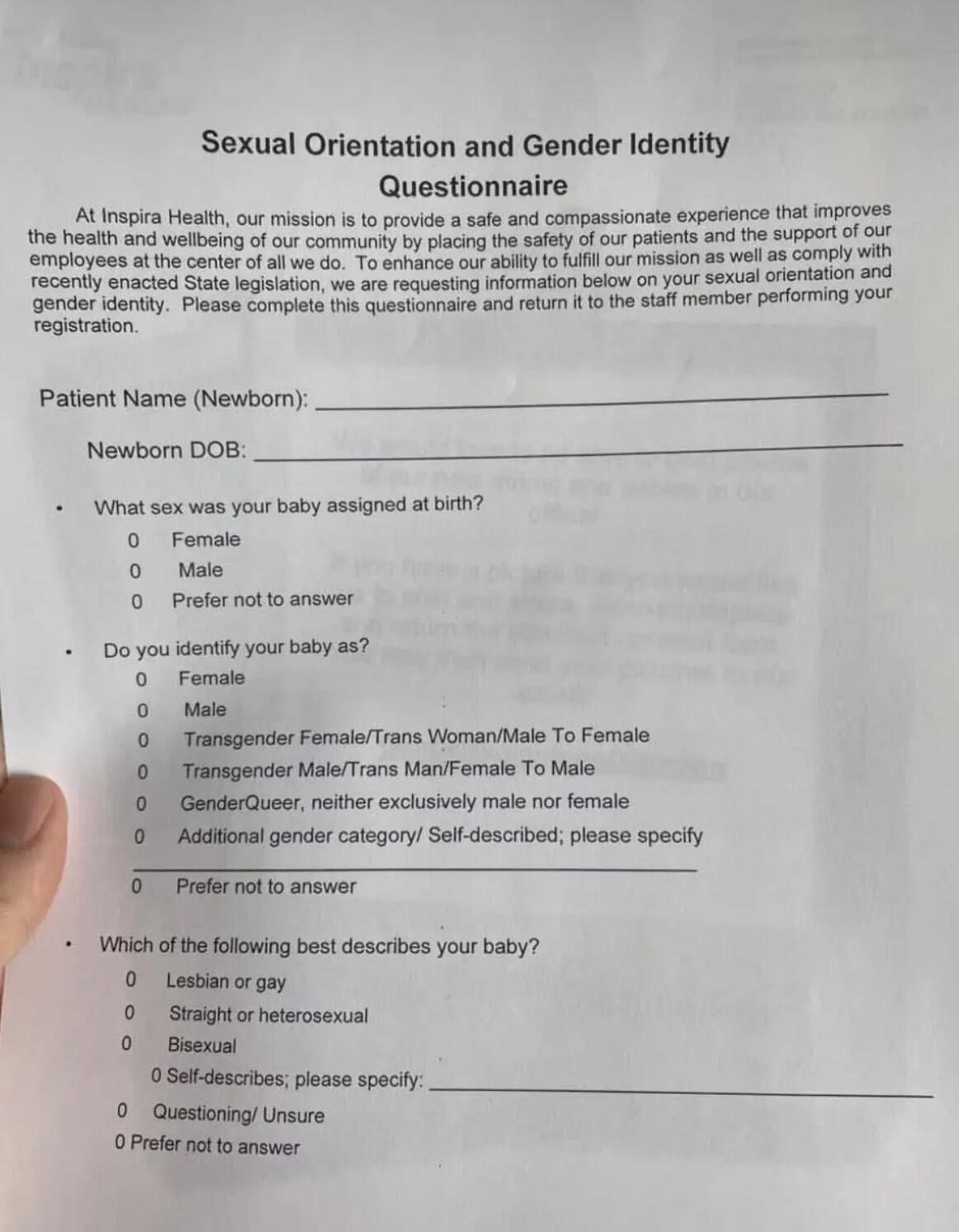 Inspira Health’s “Sexual Orientation and Gender Identity Questionnaire” asks parents to “identify” their baby as “Male, Female, Transgender, GenderQueer,” or “Additional gender category.”