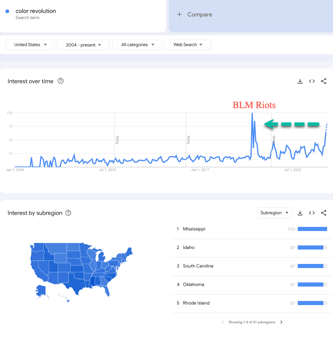 The search term "color revolution" has been catapulted into the mainstream. Google Search Trends shows the term has soared to the highest levels since the Marxist BLM rioters began burning city blocks across Democratic-run metro areas in 2020.