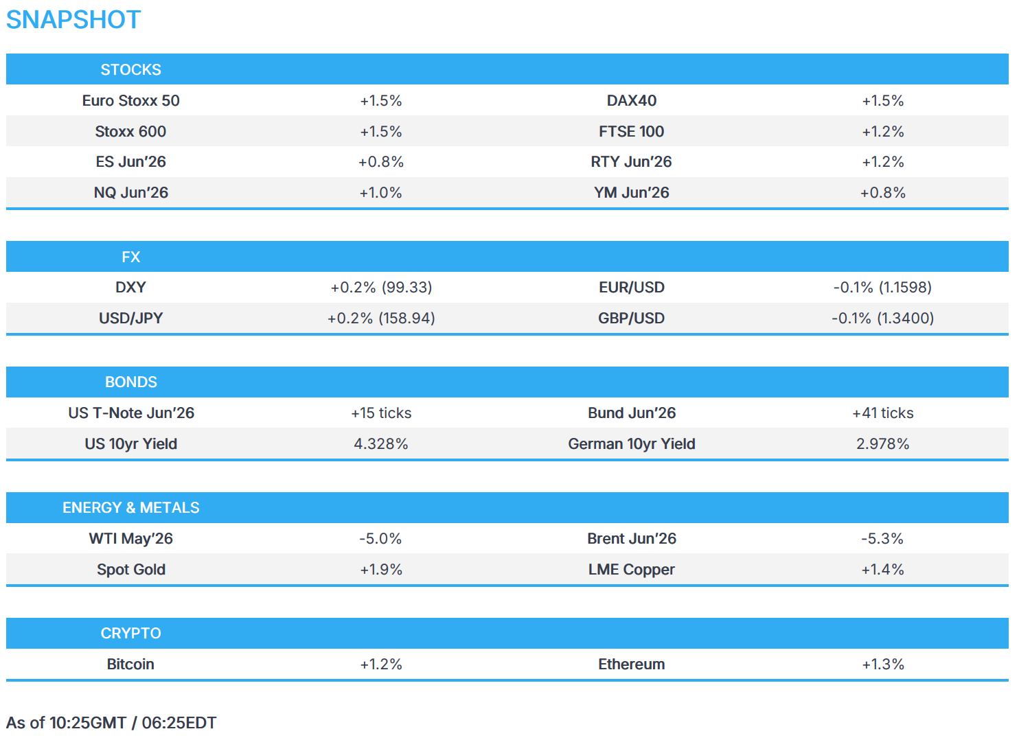 - European bourses (STOXX 600 +1.5%) are entirely in the green, benefiting from the reports that US is planning a one-month ceasefire and 15-point agreement, which has reportedly been received by Iran.