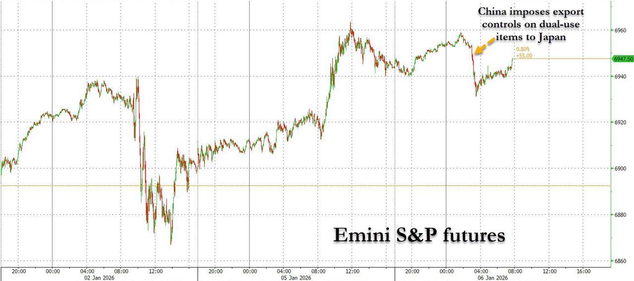 US equity futures are flat with small caps underperforming as geopolitics dominate headlines, including aftershocks from the Maduro seizure and a potential US/EU deal that provides a security guarantee for Ukraine potentially with American soldiers maintaining a presence in Ukraine. As of 8:00am ET, S&P futures are flat as a rotation into regional shares broadened and investors awaited fresh data to gauge the outlook for Federal Reserve interest rates; Nasdaq futures gain 0.2% even as Mag 7 names are weaker premarket ex-NVDA which is leading Semis higher after Jensen Huang's CES presentation. Futures took a brief spill overnight just around 3am ET when China announced it would launch export controls on Japan, which is negative for heavy machinery; futures then promptly recovered. Defensives are leading Cyclicals ex-Energy. Bond yields are higher by 1-2bp with USD also bid. Major European markets are mixed with UK leading and France lagging. Asian stocks are off to their best start since 2012 with the MXAP up 3% YTD. Today's US economic calendar includes December final S&P Global US services and composite PMIs at 9:45am. Scheduled Fed speakers include Barkin (8am) and Miran (8:30am)