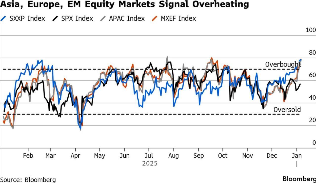 The New Year rally appears to be losing steam, despite renewed appetite for the AI trade and cyclicals over defensives. Some of the biggest action is in commodities, with an index of base metals surging to the highest since March 2022 and copper rising above $13,000 a ton for the first time, which needless to say, is and will be inflationary. At the same time, stocks in Asia surged, but as Bloomberg notes, are now getting dangerously overbought, along with markets in Europe and emerging markets. The S&P 500’s 14-day relative strength index also suggests that US stocks might have further room to run, in contrast with other regions that have surpassed levels typically seen as overbought. Macro and geopolitical risks are numerous, with Venezuela, Greenland and Taiwan all in the headlines today.