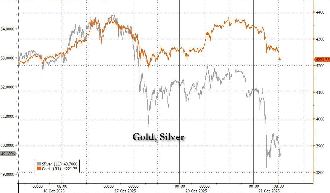 US equity futures are flat, reversing a small overnight loss, with small caps seeing some underperformance in what looks more like profit-taking than material de-risking. As of 8:00am ET, S&P and Nasdaq futures are unchanged after the S&P 500 notched its best two-day gain since June and the Nasdaq closed at a record high; premarket Mag7 / Semis are mixed but are net weaker with cyclicals underperforming as commodity names are underperforming due to a sharp overnight sell-off in precious metals, among the most notable moves today. Gold -2% and Silver -5% which appears to be de-risking in a low liquidity environment with both metals among the top YTD performing asset classes; gold set a new ATH yesterday. The rest of the commodity complex is seeing muted moves. Bond yields are flat to lower by 1bp as the USD sees a bid. The macro data focus is on Philly Fed. Coca-Cola, General Electric, Halliburton, Lockheed Martin, Northrop Grumman, RTX and 3M are expected to report results before the market open. Steady subscriber gains and rising average revenue per member should keep Netflix which reports after the close, on track for 17.3% sales growth in 3Q.