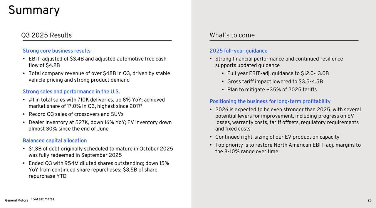GM shares are trading up about 11% this morning after the automaker delivered stronger-than-expected third-quarter results and raised its 2025 outlook. The company reported adjusted EPS of $2.80 versus $2.31 expected and revenue of $48.59 billion versus $45.27 billion.