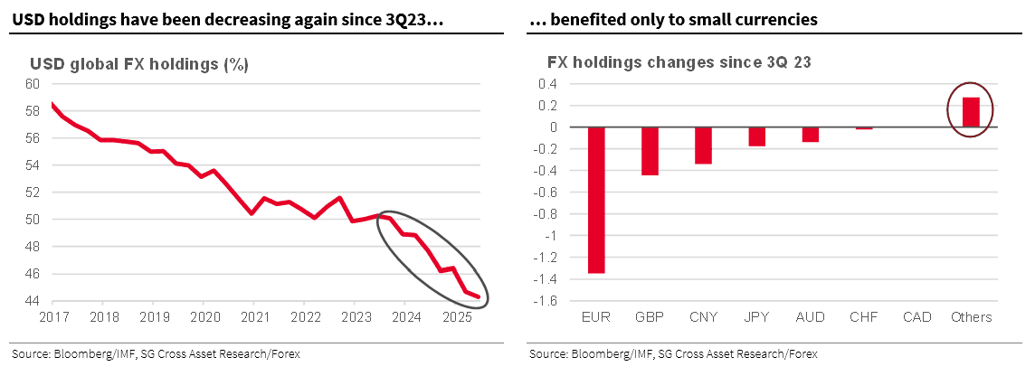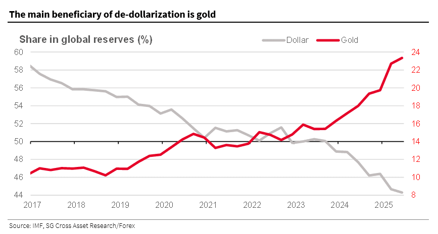 But what is perhaps far more notable is that as Socgen shows, since 2024, dedollarization has not benefited any of the major reserve currencies as one would expect in a fiat world where one currency's loss is another currency's gain. Instead, the share of gold in the IMF's classification has increased.