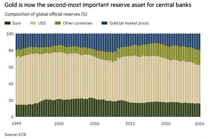 Central bank gold reserves, which peaked at 38,000 tonnes in the mid-1960s, rose again to reach 36,000 tonnes in 2024, according to the latest ECB numbers. “Central banks worldwide now hold almost as much gold as they did in 1965,” the ECB report said.