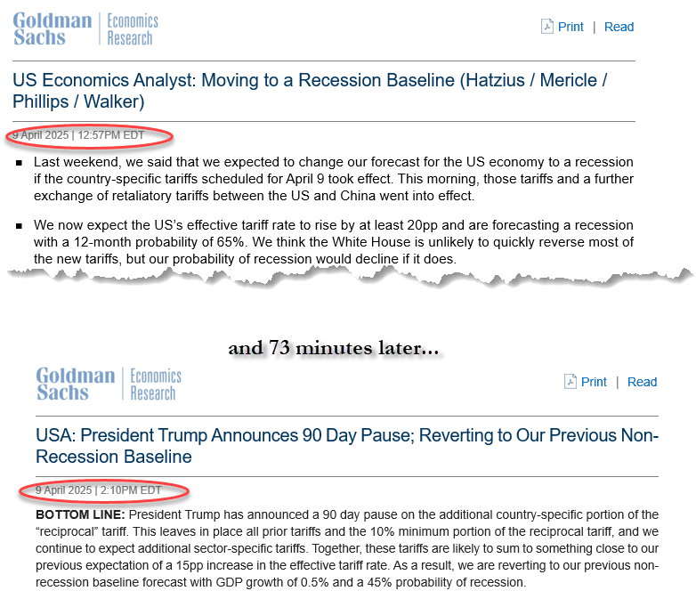 Great... only 20 minutes later Trump steamrolled all over Wall Street's laughable "scenarios" (as if they really don't know how Trump negotiates yet), and blew up every single bearish scenario. And sure enough, at 2:10pm, or about 73 minutes after Hatzius emailed his first note, the Goldman chief economist published a note titled "President Trump Announces 90 Day Pause; Reverting to Our Previous Non-Recession Baseline."