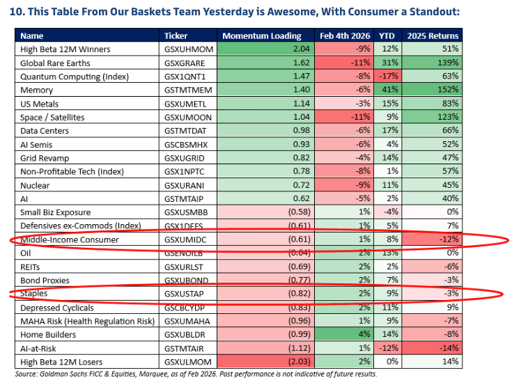 2. Under The Hood: At this point, it's not a growth scare. Momentum trades & pockets of TMT are clearly the setter of price each day. Our generally US High Beta Momentum basket was -10% yesterday, its worst day since 2020 and 2nd worst day in the last 20 years. It's barely a blip on the long-term chart. The difference between this episode and others is most seem to be struggling to pinpoint the exact reason for why (i.e. positioning, technicals, capex surprises, commodities, software worries spreading, etc). It's not a consumer growth scare though.