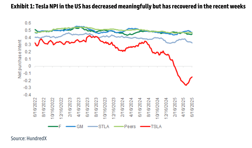 The analysts provided HundredX's net purchase intent scores for Tesla that began to slide when Musk began ramping up DOGE operations earlier this year. With Musk's exit from DOGE, there appears to be a meaningful NPI rebound; the shape of the recovery is not yet determined.