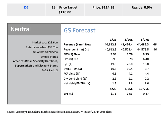 Her 12-month price for DG stands at $116, with her view of minimal upside.