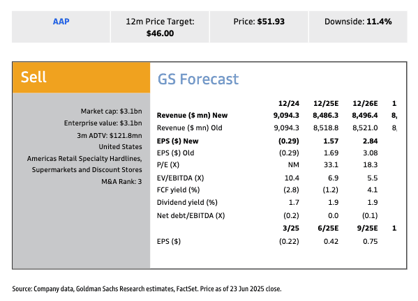 Moving on to Advance Auto Parts (AAP)—McShane downgraded the stock to Sell from Neutral, setting a new 12-month price target of $46, which implies an 11% downside. She sees AAP underperforming peers like O'Reilly Auto Parts and AutoZone in the near term, pointing to: