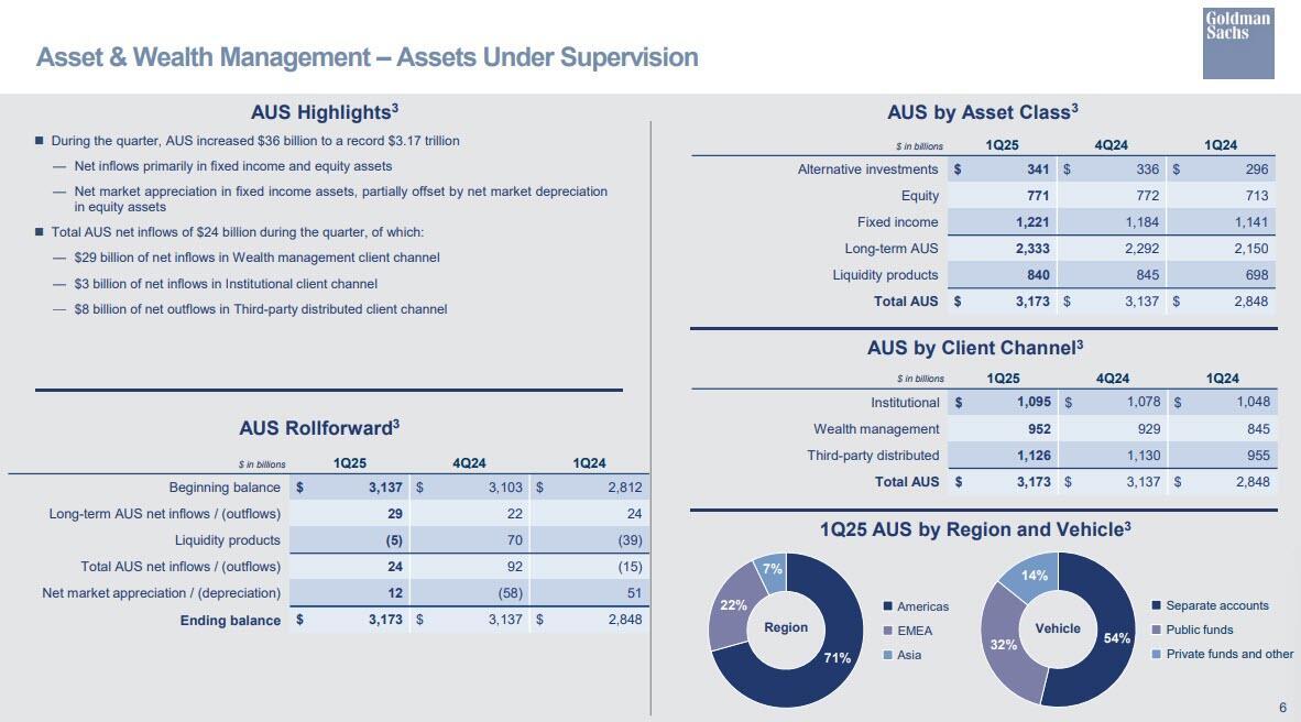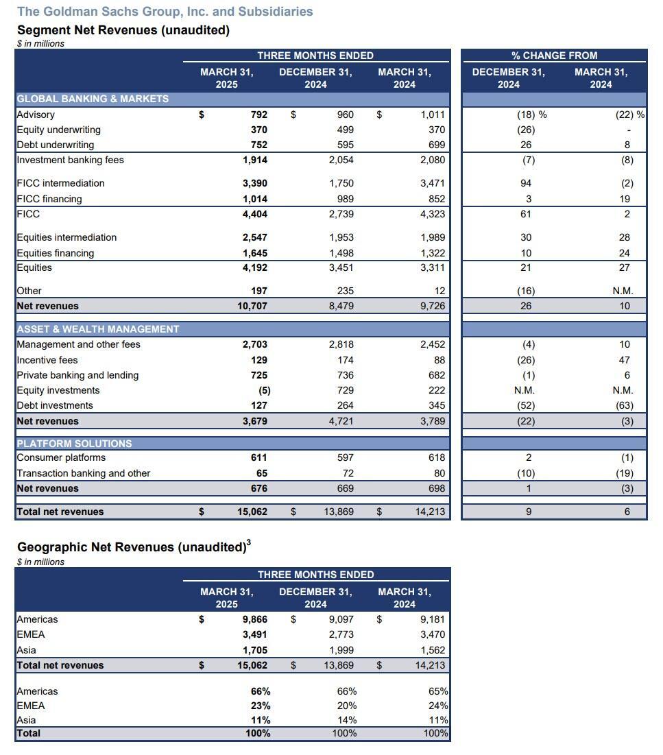 - Net revenues in Equities were $4.19 billion, beating estimates of $3.8 billion, and 27% higher than the first quarter of 2024, "due to significantly higher net revenues in Equities intermediation (primarily reflecting significantly higher net revenues in derivatives) and in Equities financing (primarily reflecting significantly higher net revenues in portfolio financing)."