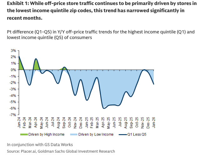Building on Goldman analyst Scott Feiler's note last week that consumer trends remain resilient despite ongoing K-shaped concerns, Brooke Roach, a Managing Director in Equity Research at Goldman covering the U.S. retail sector, published a consumer note on Tuesday analyzing recent store-traffic trends across income and ethnicity cohorts.