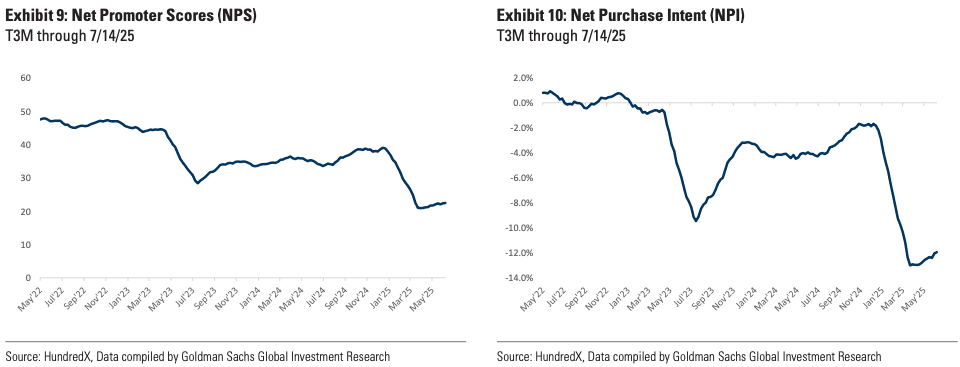 Net Promoter Scores (NPS) and Net Purchase Intent (NPI) metrics via HundredX have potentially bottomed out.