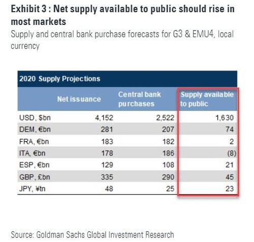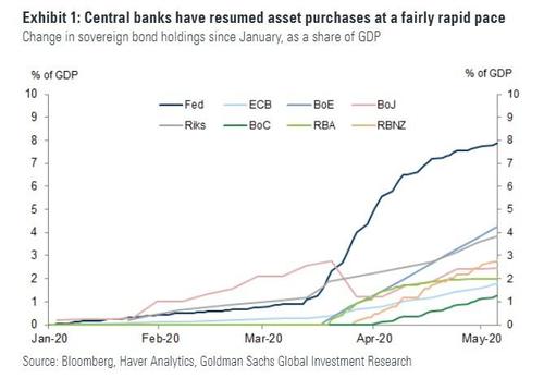 As Goldman writes overnight, putting the problem in its proper context, "Central banks have been purchasing sovereign bonds at a rapid pace (Exhibit 1), faster than past QE programs in most cases. These purchases are occurring against a backdrop of a surge in fiscal deficits, which will require enormous amounts of additional sovereign supply to finance them."