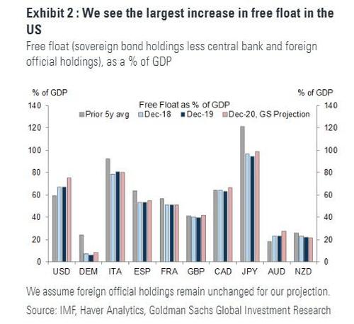 Which makes sense, of course: after all helicopter money, which is what we have now that MMT (Magic Money Theory) has been shoved down everyone's throat without any debate, only works when there is coordination between the Treasury and the central bank. And while until now Fed purchases have generally offset Treasury issuance, that coordination is about to end. As Goldman puts it, "Central bank buying should absorb a substantial amount of upcoming issuance, though we expect increases in “free float” across most markets, most notably in the US, which adds to the medium-term case for higher yields and steeper curves there."