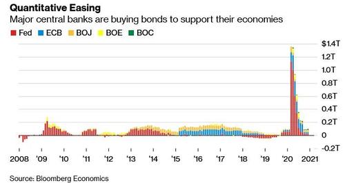 Finally, it's not just us reaching this conclusion: yesterday - one day after our dire assessment - Bloomberg reached the same conclusion, and in "An $8 Trillion Spree Sets Clock Ticking for Bonds’ Judgment Day" in which it wrote that "investors are mopping up the sales as long as central banks engage in so-called quantitative easing, buying an unlimited amount of debt to counter the ravages of the pandemic. But at the first whiff of a recovery, or a pullback from policy makers, all bets may be off. Throw in the threat of inflation amid a global fiscal splurge exceeding $8 trillion, and bond investors look set for a toxic cocktail of risks in the not-too-distant future."