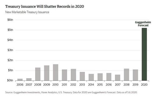And since it is just a matter of time before Congress has to pass yet another fiscal package which will be at least another trillion dollars, and up to $3 trillion if the Democrats get their wish, one can say that Guggenheim's projection of over $5 trillion in debt issuance this calendar year will be wildly conservative.