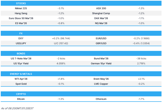 - APAC stocks were pressured with risk appetite weighed down by geopolitics as the Iranian conflict entered a fourth day, and with US President Trump warning of larger strikes to come.