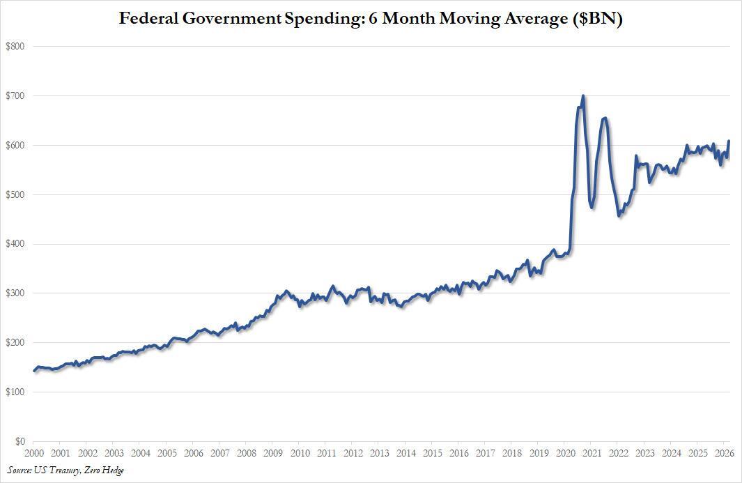Putting it all together, the big picture emerges, one where outlays on most categories continues to rise - certainly defense, social security and health - but as a result of the drop in rates in the past 1.5 years, the gross interest expense on US debt has been relatively flat in 2026, and in March it was $1.26 trillion, or where it started the year.