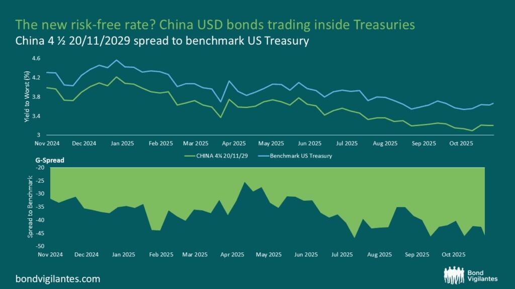 In November 2024, China issued $750 million of 5-year USD denominated bonds at T+3bp and they have been trading 30bp or more inside the Treasuries since then. Therefore, the perceived weakening US exceptionalism is hardly an explanation because mid-November last year very few investors would have anticipated the events that unfolded since the US Presidential election.