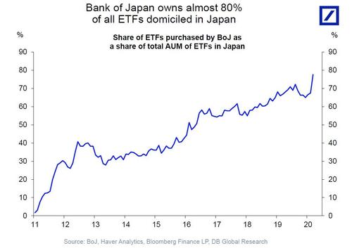 Then, year after year, we would hear from the likes of Kuroda and Draghi how the BOJ and ECB will continue and even extend their insane monetary policy, which now includes the purchase of 80% of all Japanese ETFs...