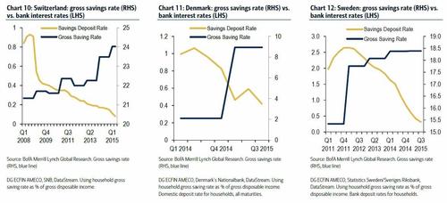 Nobody had an answer, until in late 2015, we offered a glimpse into what was structurally flawed with this "model": using a report by Bank of America, we showed that not only had household savings rates not declined in countries with negative rates, they had in fact risen. There was a simple reason for this, as the BIS had highlighted: ultra low rates may perversely be driving a greater propensity for consumers to save as retirement income becomes more uncertain.