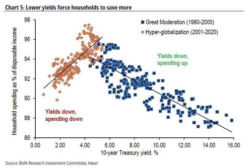 Below we post a chart from the latest Research Investment Committee report by BofA titled "Stagnation, stagflation or elevation", which with just one image blows up everything that is flawed with monetary policy. It shows that while lower rates indeed stimulate spending and lead to lower savings, this effect peaks at around 4% and then goes negative. In fact, the lower yields - and rates - drop below 4% - not to mention to 0% or below - the lower the propensity to spend and the higher the savings rate!