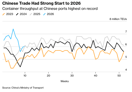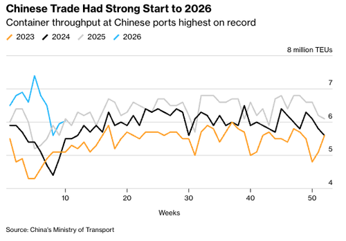 Total exports for January nearly topped $357 billion, the second-highest on record, according to Bloomberg calculations based on official data.