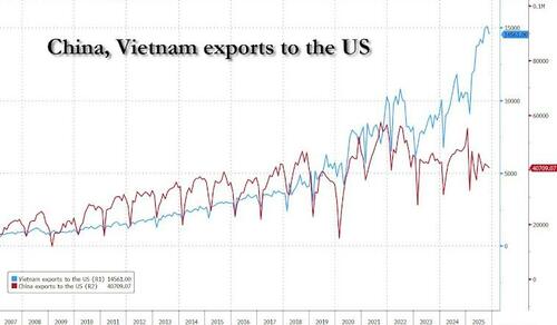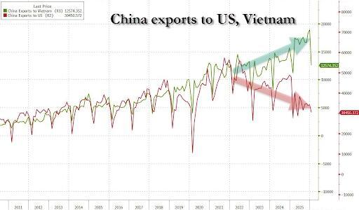 However, instead of exporting to the US, China is 'trans-shipping'. Exports from China to Vietnam are soaring inversely to the decline in exports to US...