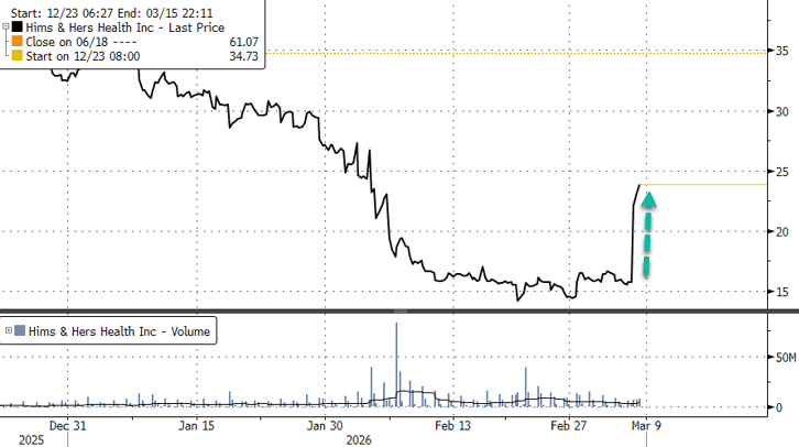 Bloomberg headlines crossed around 8:30 a.m. ET, stating that HIMS will no longer offer knockoff GLP-1 drugs on its telehealth platform and will instead offer NOVO's GLP-1 shots and the Wegovy pill. In return, NOVO has withdrawn its patent infringement lawsuit against Hims.