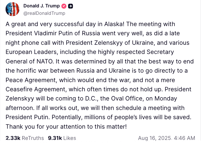 A great and very successful day in Alaska! The meeting with President Vladimir Putin of Russia went very well, as did a late night phone call with President Zelenskyy of Ukraine, and various European Leaders, including the highly respected Secretary General of NATO. It was determined by all that the best way to end the horrific war between Russia and Ukraine is to go directly to a Peace Agreement, which would end the war, and not a mere Ceasefire Agreement, which often times do not hold up. President Zelenskyy will be coming to D.C., the Oval Office, on Monday afternoon. If all works out, we will then schedule a meeting with President Putin. Potentially, millions of people's lives will be saved. Thank you for your attention to this matter!
