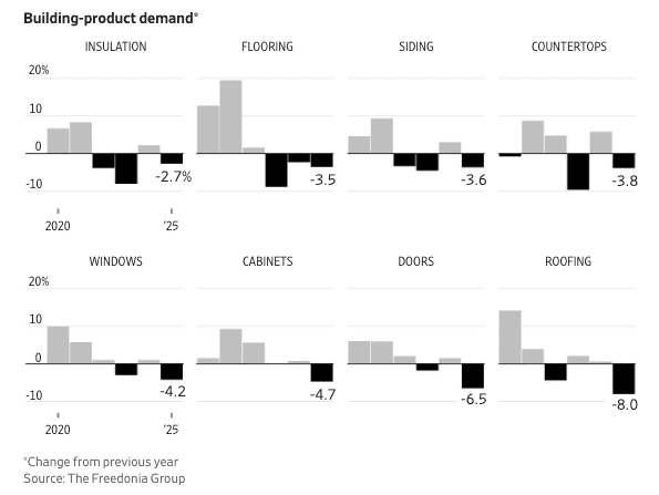 In a separate report, The Wall Street Journal cites The Freedonia Group's data showing that a frozen housing market has curbed demand for appliances, cabinets, and flooring, among other products.